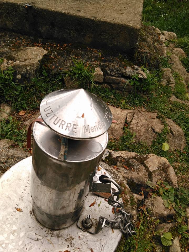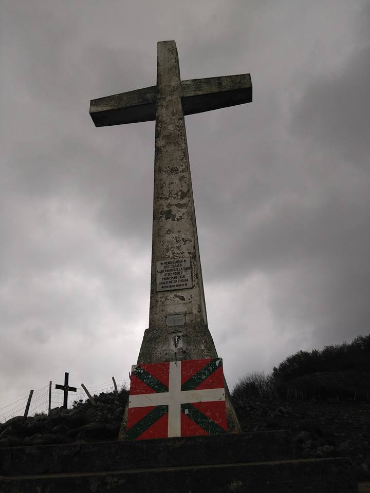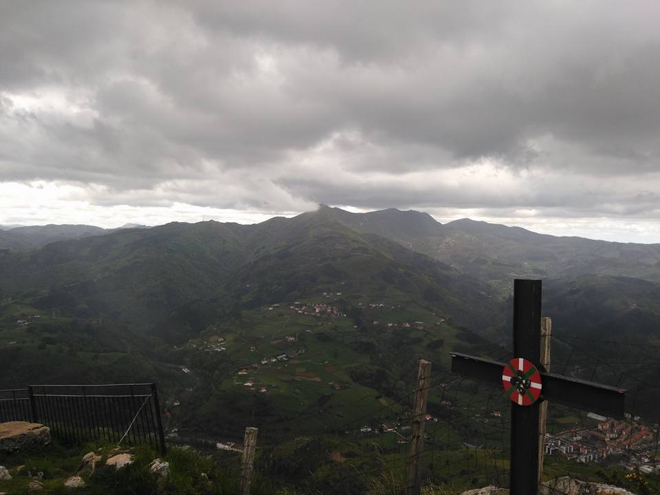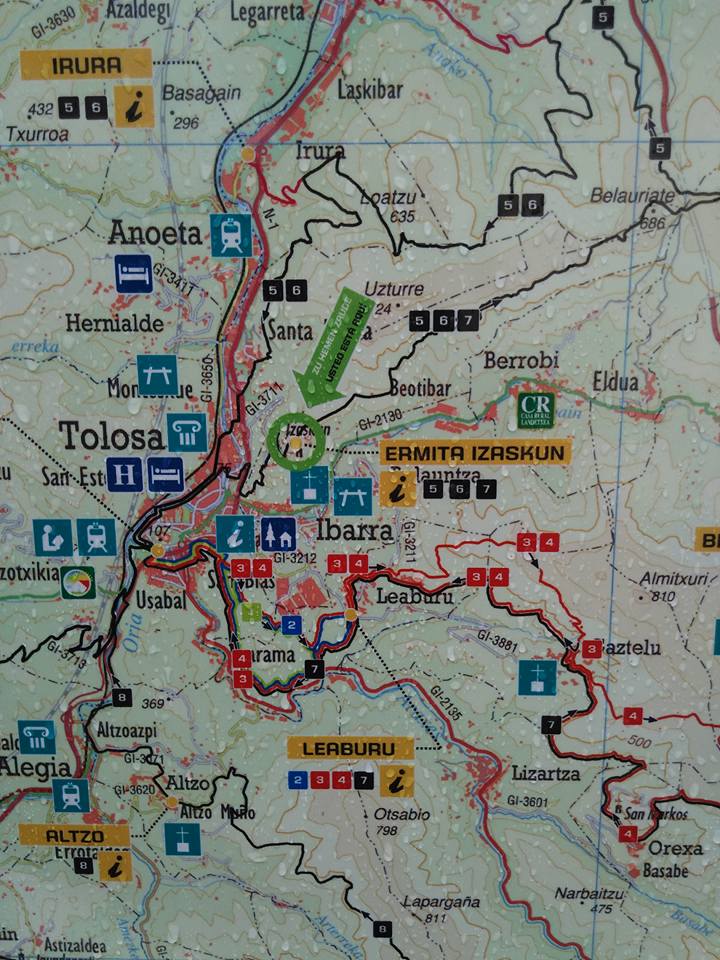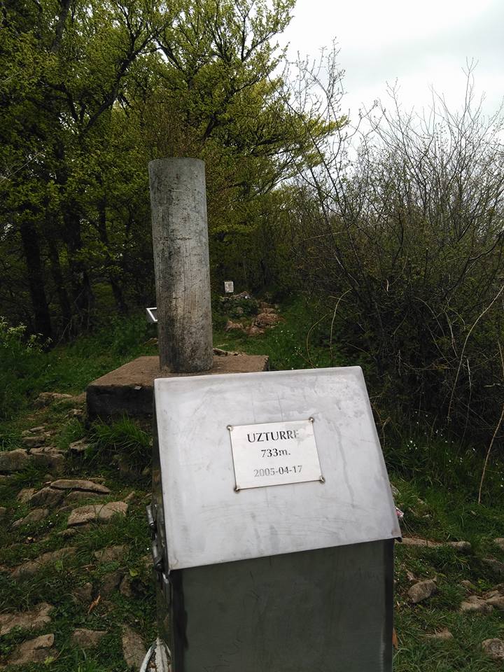 Cuando la ruta comienza a ascender hacia la cresta arbolada, junto al sendero, aparece un pequeño muro de piedra, hay que estar atentos para desviarnos por la derecha y alcanzar la cima donde se encuentran los buzones del Uzturre ( 730 m ) y el vértice geodésico escondidos entre la maleza..... Se regresa al sendero junto al muro de piedras y se continua descendiendo hasta llegar a la imponente Cruz de Uzturre y su fantástico mirador sobre Tolosa y el valle del Oria. La vuelta a la Ermita de Izaskun la haremos por la ruta clásica.