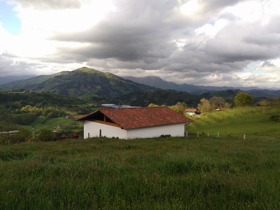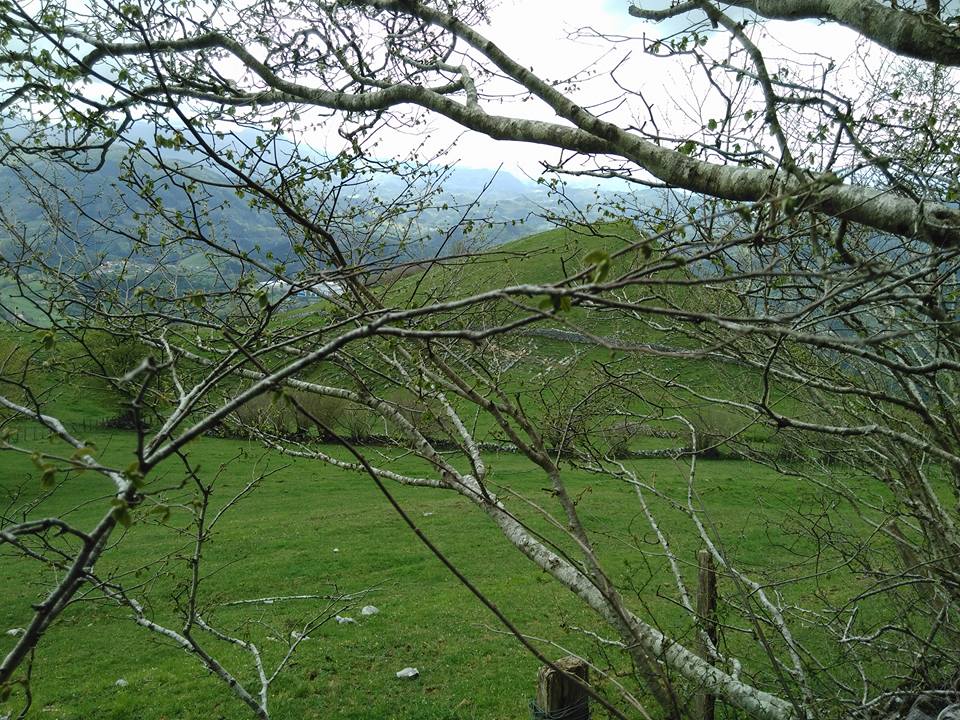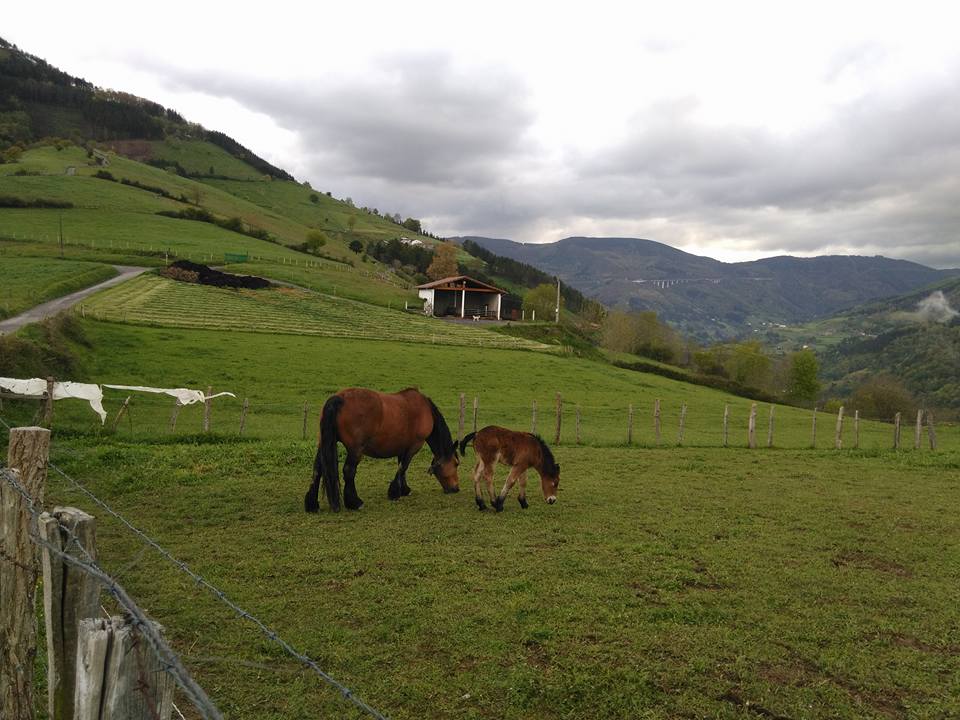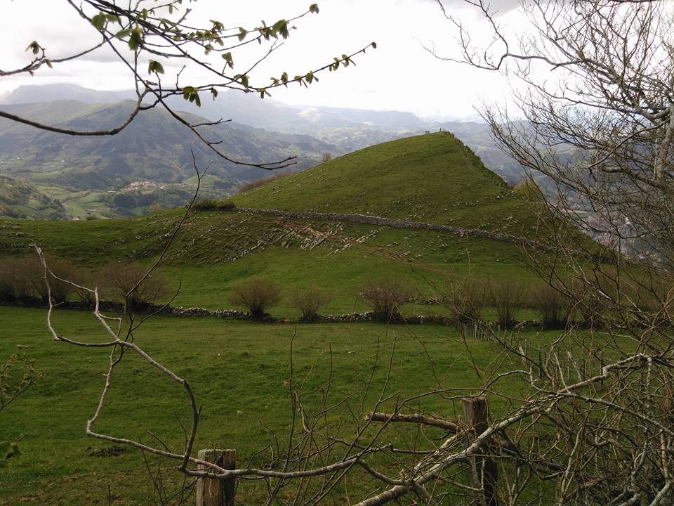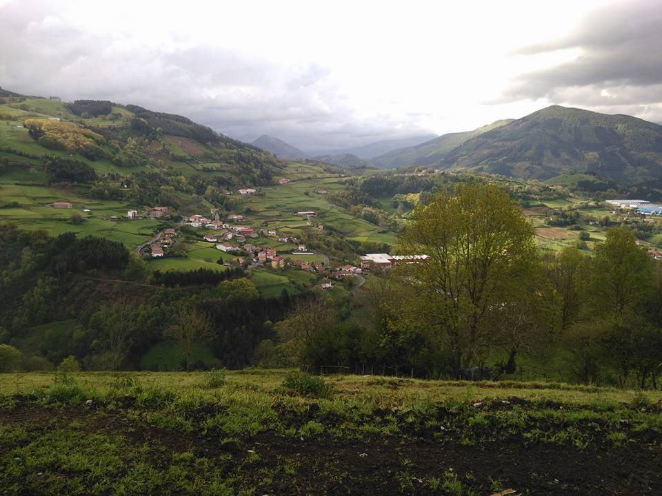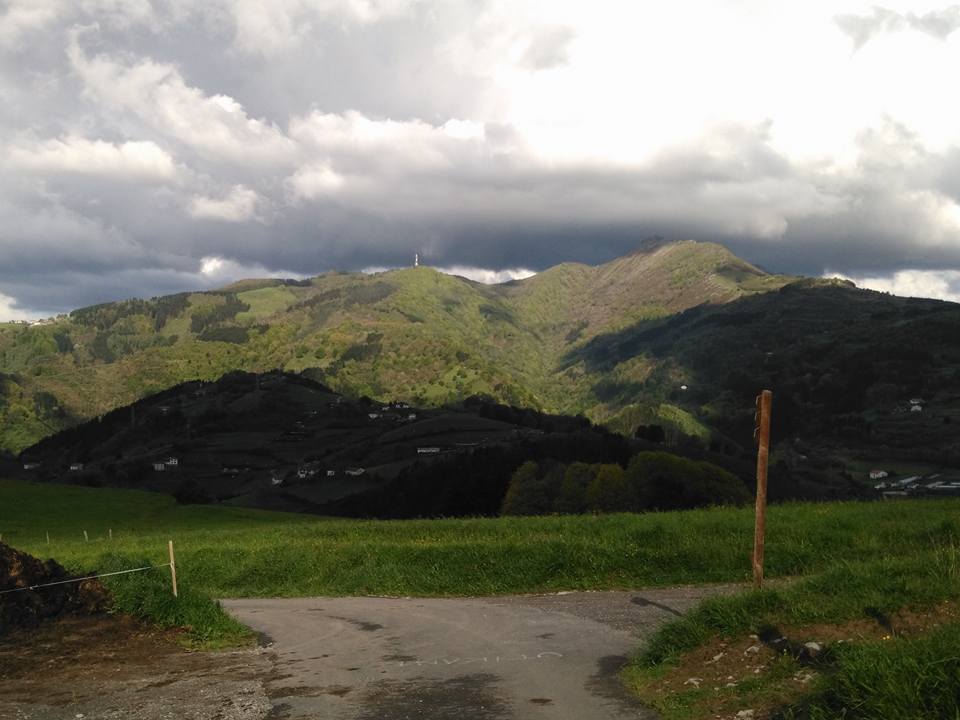 Así que me pongo en marcha desde la Ermita de Ntra. Sra. de Izaskun y allí tomo la pista que asciende suavemente por la loma suroeste del Uzturre. En el primer cruce,se sigue de frente. Tras pasar la colina de Harriundieta , la pista entra en una zona de campas de hierba cercadas donde los caballos se relajan y pastan. Un poco más adelante se llega a una bifurcación donde se toma el camino de la derecha para ir a Belabieta, y un poste de señalización indica la dirección hacia los caserios: Orita, Maitabekoa, Maitagoikoa. La pequeña pista asfaltada asciende suavemente por la falda sur del Uzturre con bonitas vistas hacia el pueblo de Belauntza y el el valle de Berastegi. Llego al caserío Orita curioso cuándo menos, con un escudo en su fachada con los apellidos familiares, muy cuidado y adornado con aperos de labranza y de elaboración de sidra.