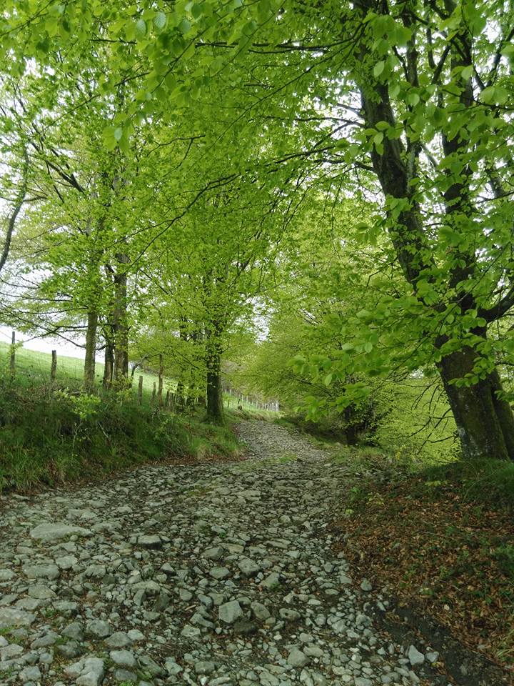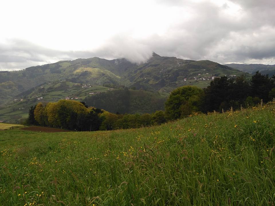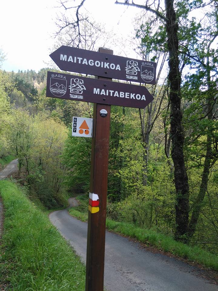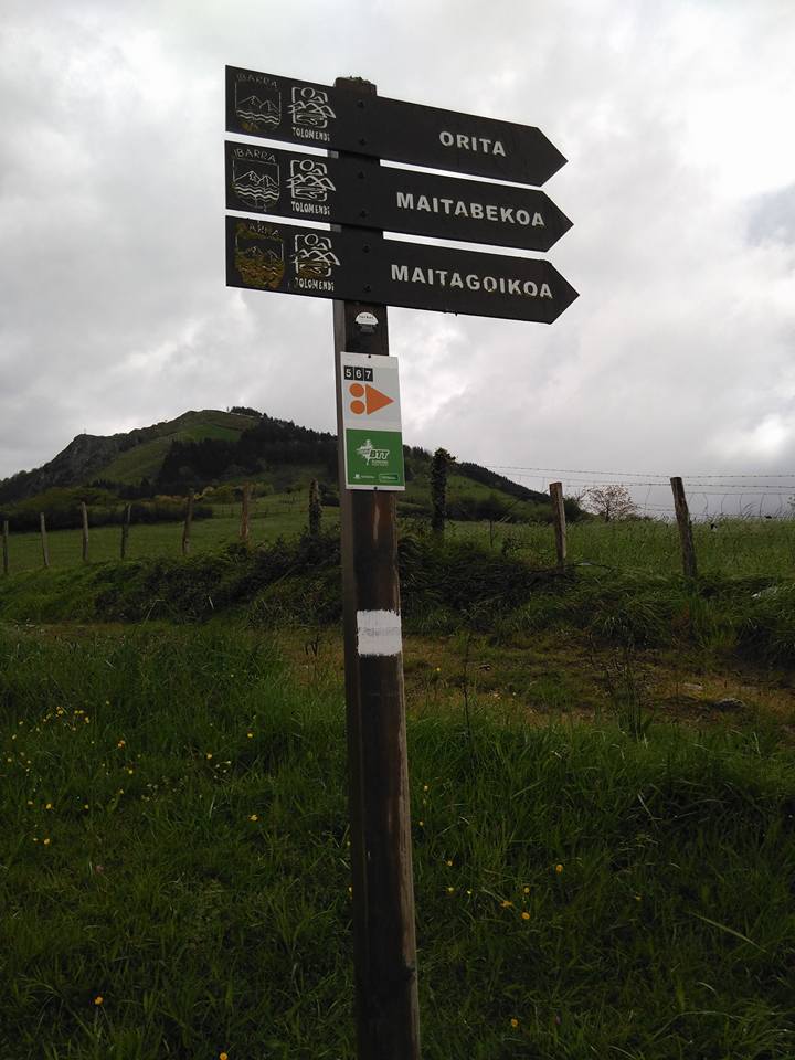 Un poco más adelante yendo por la pista que resulta muy cómoda se encuentra otro cruce donde se asciende por el camino de la izquierda, en dirección al caserío Maitagoikoa; aquí hay otro poste con señalización de caseríos: Maitagoikoa para la izquierda y Maitabekoa por la derecha. Enseguida se llega a a la fuente de Orieta. Se siguen las marcas del GR, aunque ahora el camino es más empedrado sigue manteniendo más o menos la misma pendiente, pasa al lado de la fuente de Urteta con su agua muy fresca. Dejada la fuente atrás enseguida se llega a Saiako borda situada a la izquierda del camino. Poco después se llega al collado de Akolodi a la derecha se situa el monte redondeado de Belabieta y la izquierda el comienzo de la cresta herbosa del Uzturre donde en esta parte recibe el nombre de Muñazki. Aquí dejamos las marcas del GR que nos conducirían a Belabieta (pero eso será otro día...) El camino sigue siendo cómodo, ancho y ahora herboso para que podamos ir disfrutando de las vistas que nos ofrece.